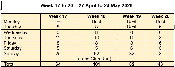 NOTE 1. This is the beginning of our taper – 32 km race in week 19 – Thank You.